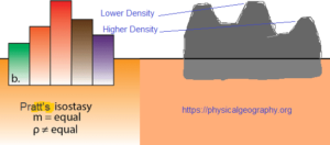 Pratt suggested that the different heights of mountains were due to blocks of different densities floating at the same base level. This idea can be illustrated with the help of the following figure. Blocks of metals having different densities are immersed in the mercury. They have equal weights, and cross-sections but different lengths. These blocks sink to the same level in the mercury but their upper surface stands out at different heights. The lighter the block, the higher it stands. Here the longer blocks represent mountains and the lower blocks are ocean basins.